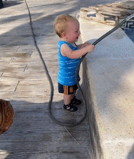 宝宝拿着水管想给狗狗洗澡澡