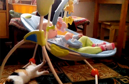 会带娃的猫咪,用爪子推摇篮荡秋千