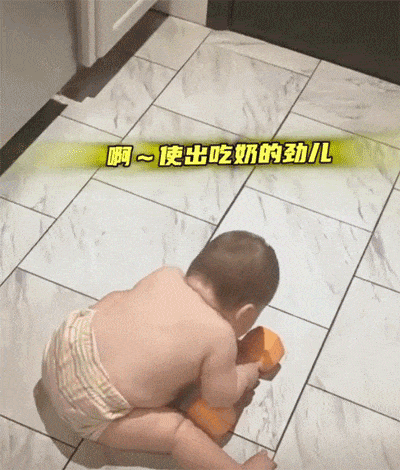 宝宝使出吃奶的劲也拿不动哑铃,看来还是身体太虚了