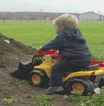小朋友开挖掘机往头上倒沙子