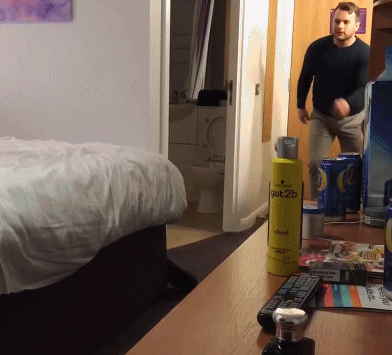 兴奋的狗狗在床上一个翻滚摔到床下去了