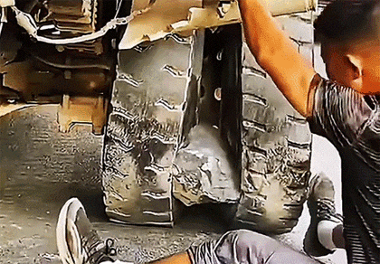 大货车轮胎间被卡石头了,用锤子都敲不下来