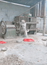 拴着绳的狗狗转轮子,玩得很开心