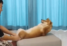 兴奋的狗狗在床上一个翻滚摔到床下去了