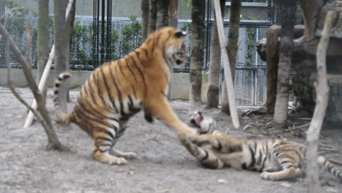 公园里两只顽皮打闹的小老虎