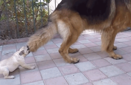 咬着大狗尾巴转圈圈的小狗,真是又菜又爱玩