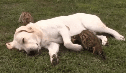 顽皮猫咪偷偷钻进狗狗的怀抱里