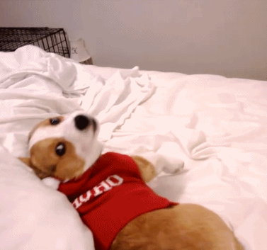 兴奋的狗狗在床上一个翻滚摔到床下去了