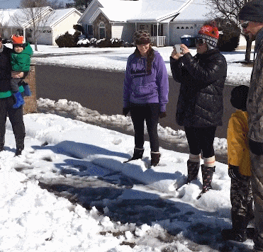 爸爸抓住儿子向前撞雪人,真是个坑娃的爹啊