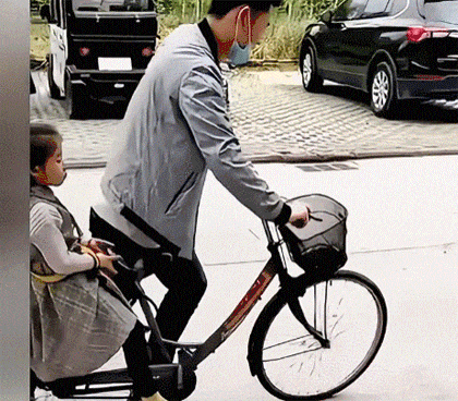 爸爸骑自行车带女儿上街,熟练的动作让人心疼