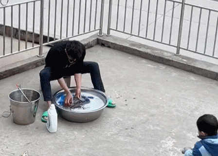 小朋友玩滑板车刹车不及时,一头栽进了爸爸洗衣服的…