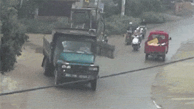 第一次撞摩托车,第二次被货车撞飞了