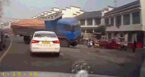 第一次撞摩托车,第二次被货车撞飞了