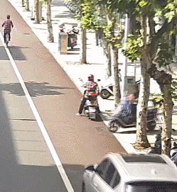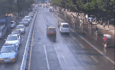 一辆三轮摩托车在市区主干道上疯狂逆行