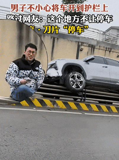 男子不小心把车开到护栏上,路过司机调侃:这里不让…