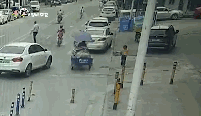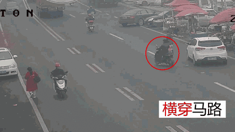 骑电动车横穿马路,结果被小车撞飞
