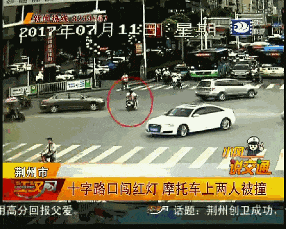 十字路口撞红灯,两人双双被撞翻