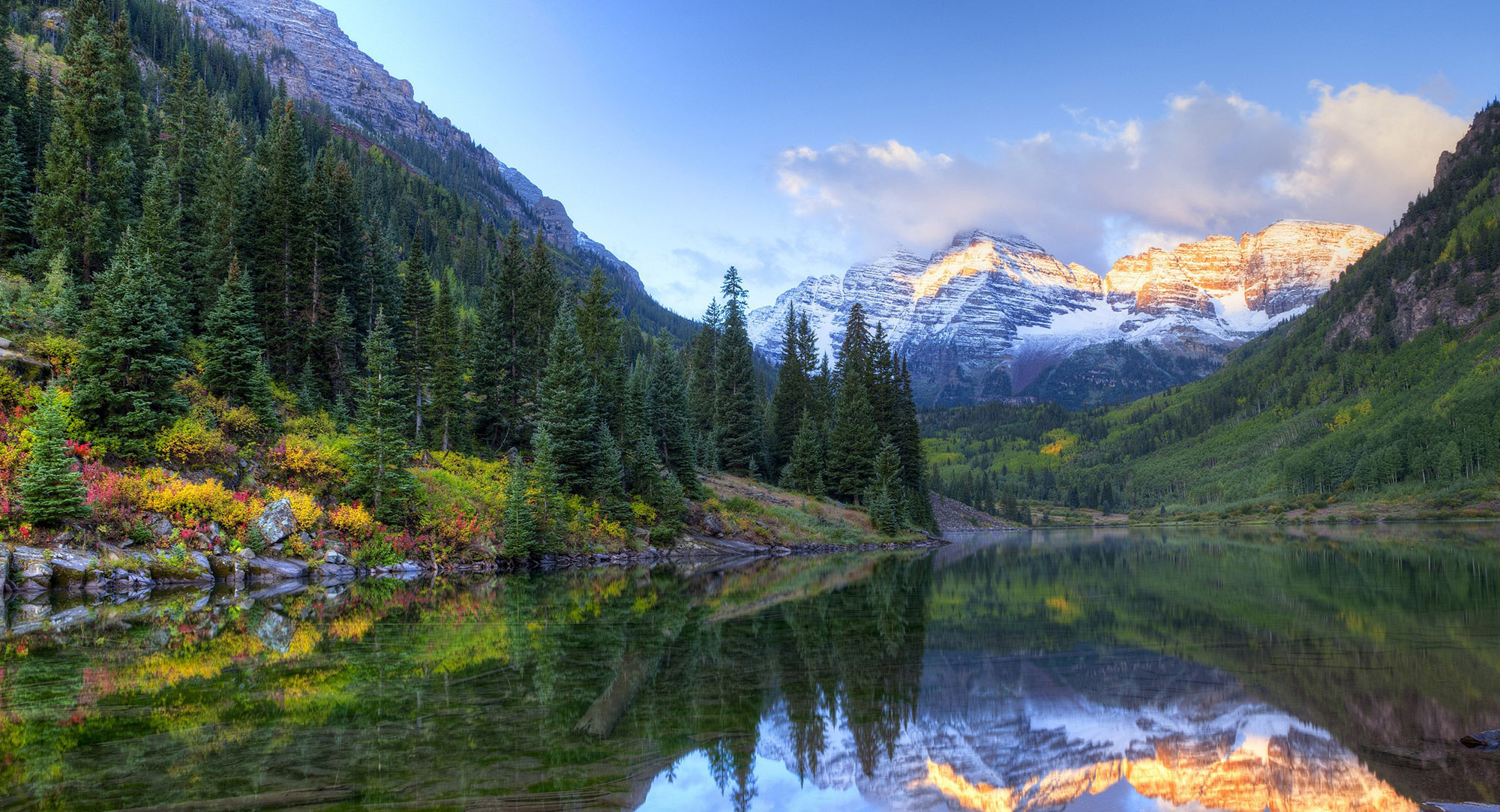 晨光为雪山镀上金边,湖水把青山绿水都装进了镜面里